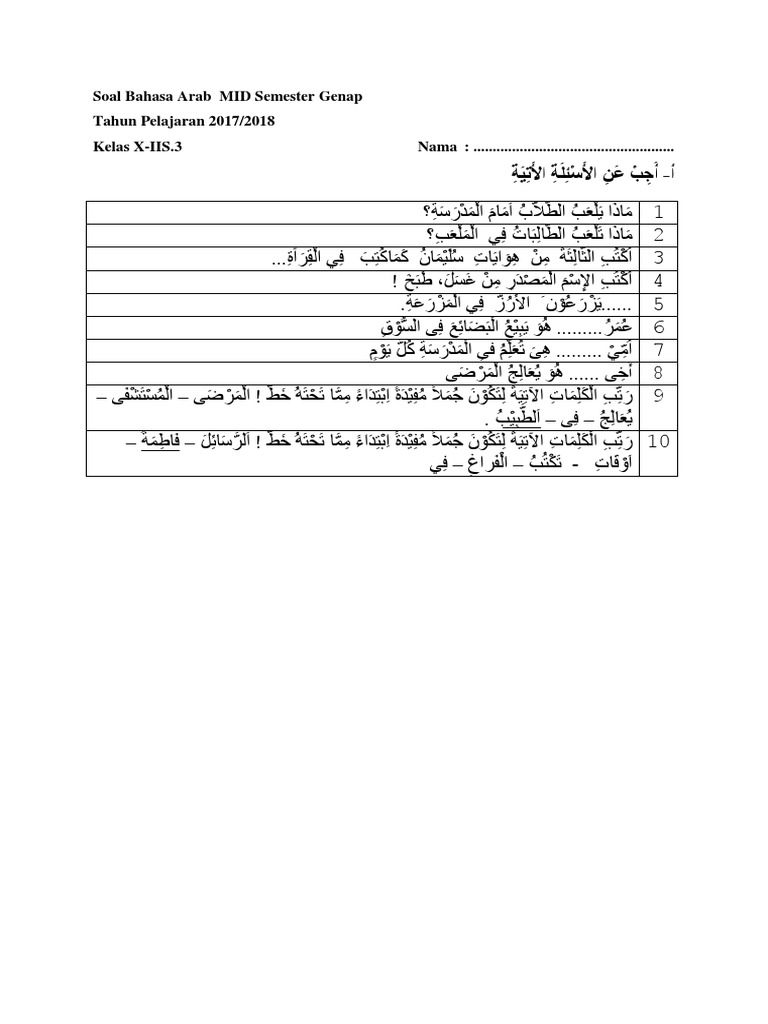 Soal Bahasa Arab Kelas 10 Semester Genap / Soal Bahasa Arab Kelas 11 Semester 2 Dan Kunci Jawaban Peranti Guru / Download soal uas semester 1 dan 2 bahasa arab sdit mi tahun 2015.